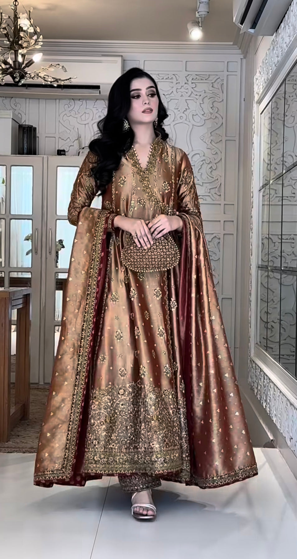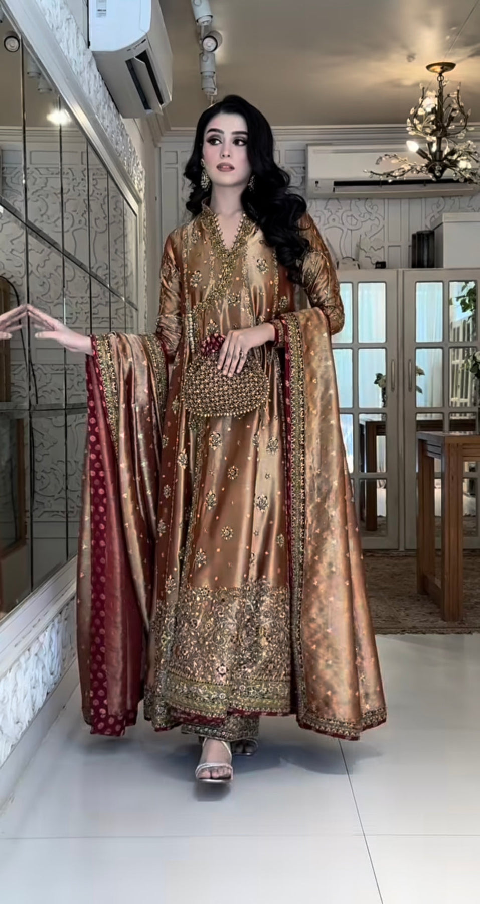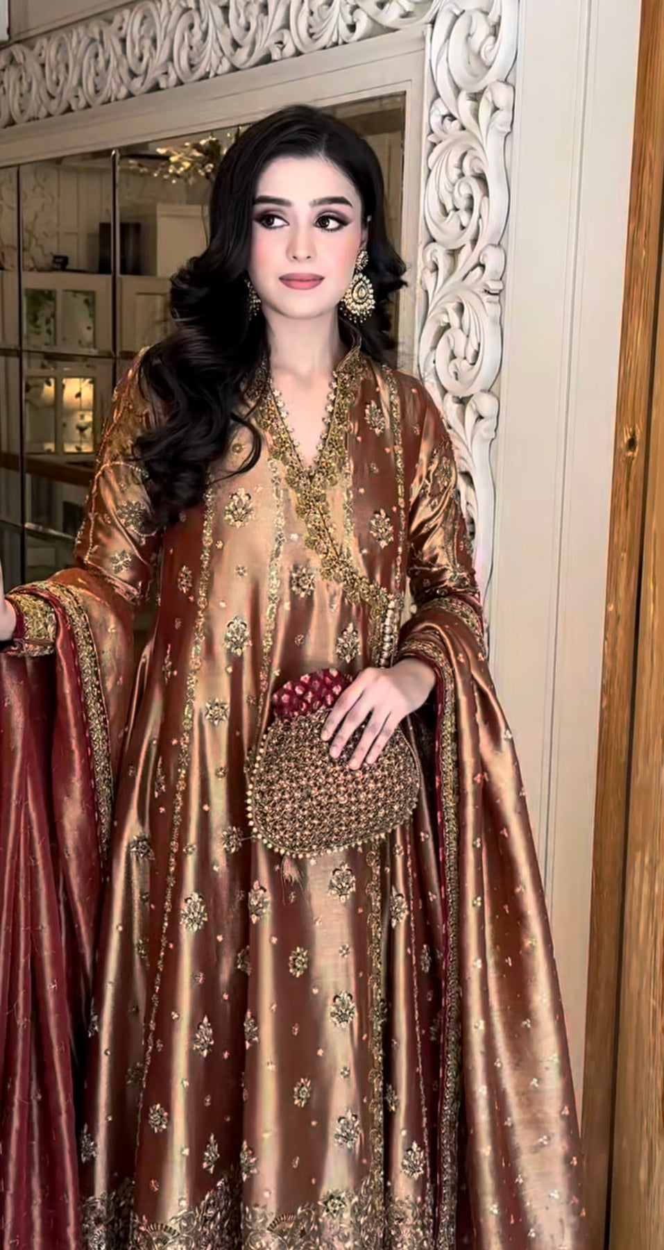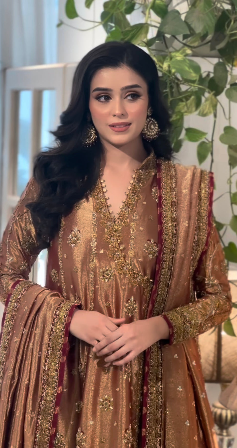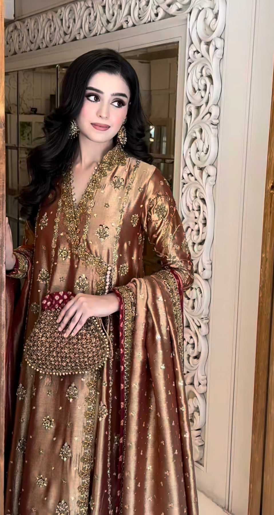 The ASWAD ensemble by Haris Shakeel is a majestic creation that exudes timeless regality. The outfit is crafted in a rich bronze-gold hue, adorned with meticulous hand-embellishments featuring intricate floral motifs, sequins, and more detailings that cascade gracefully across the front. The long silhouette is paired with a heavily worked hemline, enhancing its grandeur.