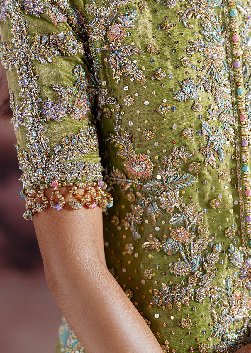 Shadan evokes the grandeur of a bygone era, where every detail was a testament to festivity. The shirt glistens with intricate zardozi work, its surfaces enlivened with delicate accents of colored thread. Playful handmade tassels dangle in gentle motion, like jeweled whispers echoing the liveliness of mehfils past. The dupatta unfurls as a tapestry of nostalgia, bordered richly on all four sides, its expanse scattered with a dense spray of sequins and mukaish. The edges, kissed with delicate kiren, recall the heirloom finishes of treasured trousseaux, carrying with them the romance of old-school charm. Anchoring the ensemble is a farshi gharara, opulent in sweep and grandeur. Its voluminous flare is scattered with embellishment, culminating in a hem weighted with resplendent gota, each stripe gleaming with the brilliance of molten gold. A matching pouch is a final accent that echoes its vintage soul, proving no detail is left untouched.