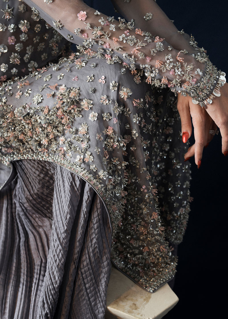 This grey epitome of grace is completely hand embellished. Featuring a key-hole neckline. Three dimensional floral embellishments donned with silver pipes, sequin, stones tastefully blended with grey and pink sequin and stone work. Paired with crushed silk sharara with embellished borders. Completing the look with sequin sprayed organza dupatta.